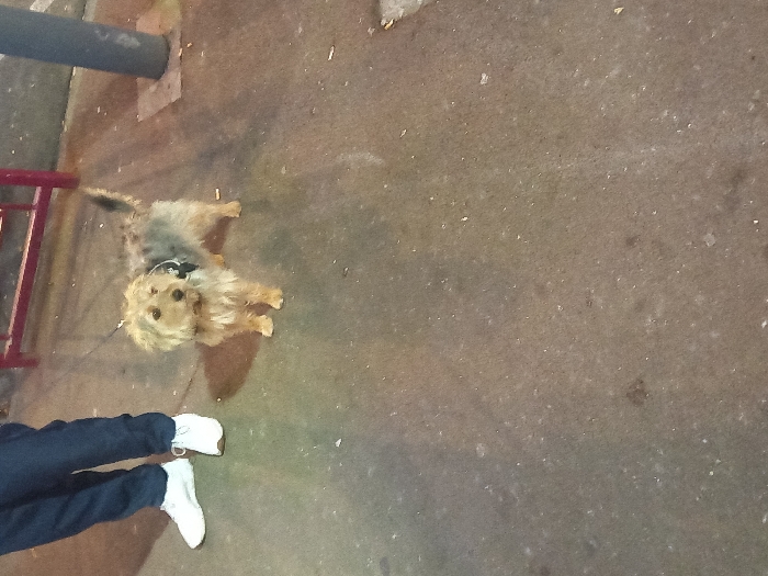 A small, long-haired, brown dog with a black collar stands on a weathered, gray sidewalk. To the left, a pair of legs clad in dark denim and white sneakers are visible. Part of a red metal structure and a gray pole can also be seen on the left side of the picture. The sidewalk is rough and uneven.
