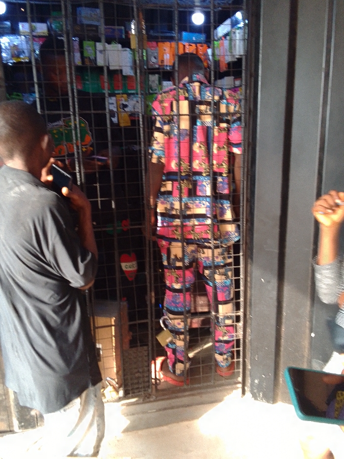The scene depicts a street-level view outside a retail establishment in Nkwelle Ezunaka, Nigeria, illuminated by direct sunlight on the concrete ground. A black metal security gate, secured with a silver padlock, separates the foreground from the shop's interior. In the left foreground, an individual is observed from behind, wearing a dark short-sleeved shirt and light-colored trousers, holding a dark smartphone to their right ear. Behind the gate, a second individual stands from behind, dressed in a vibrant, multi-colored patterned shirt and matching trousers featuring pink, blue, beige, and black designs; this person faces deeper into the shop. The shop's interior, visible through the gate, displays shelves stocked with various small goods, likely electronics accessories, under a single white overhead light, with a red heart-shaped sign bearing "cut" on the left side. On the far right, a partial view of a human right hand with painted fingernails holds a turquoise-cased smartphone horizontally. A dark corrugated metal panel borders the right side of the frame.