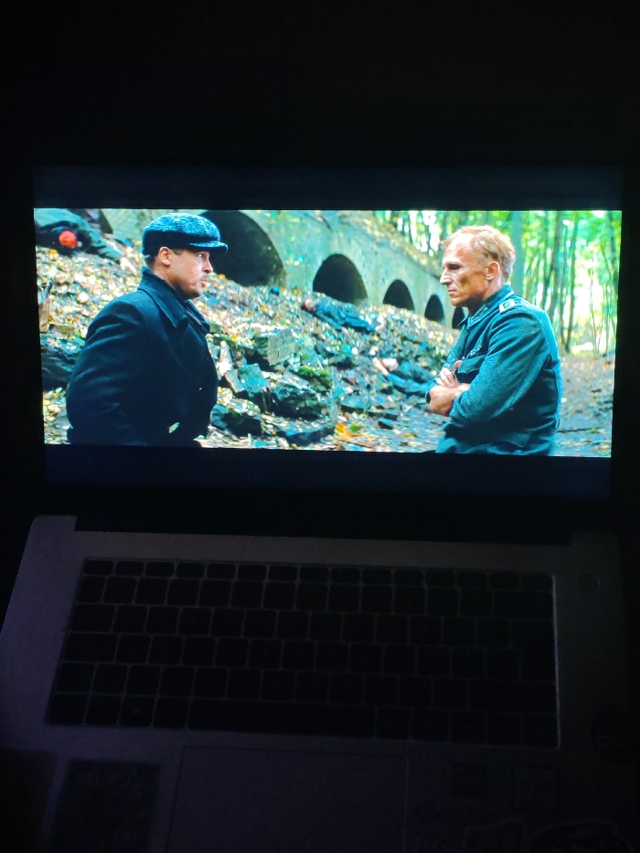 The image displays a laptop screen showing a scene from a film or television show, viewed from a slightly elevated angle in a dimly lit room