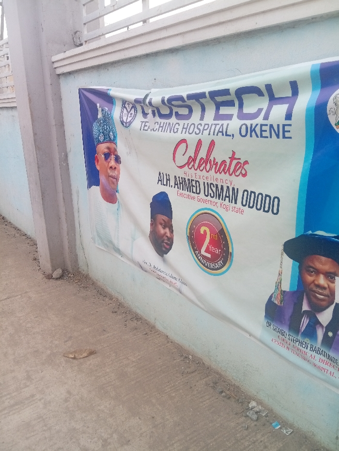 A large banner is affixed to a light-colored wall outdoors, likely at KSUSTECH Teaching Hospital in Okene, Nigeria