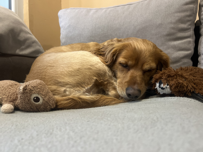 - "A golden-brown dog with medium-length fur is observed sleeping, curled up on a light grey textured textile surface, likely a blanket or couch cushion, in an indoor setting located in Shumen, Bulgaria" by FM-2EKTp2, licensed under CC BY 4.0