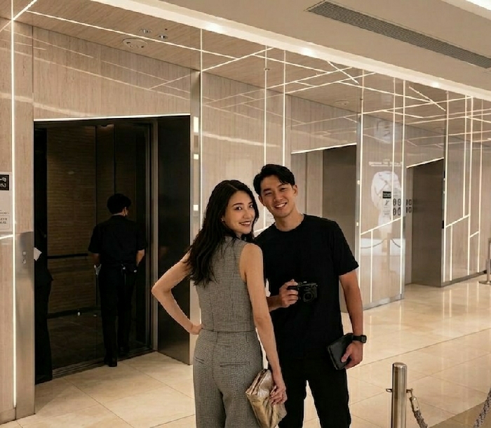 An indoor scene within a modern building, potentially a hotel or office lobby, is depicted in Chuo, Japan. Two individuals of East Asian descent, a man and a woman, stand in the mid-ground, facing and smiling towards the camera. The woman, positioned to the left, has long dark hair and wears a sleeveless gray plaid top with matching wide-leg trousers. She holds a light gold-colored clutch bag in her left hand, which rests at her hip. The man, to her right, has short dark hair and wears a black short-sleeved t-shirt and black trousers. He holds a black digital camera in his right hand and a black pouch in his left hand. In the background, to the left, a partially open elevator door reveals a third individual, seen from behind, wearing a dark uniform consisting of a short-sleeved shirt and trousers, appearing to enter or exit the elevator. The environment features light-colored, polished walls, likely marble or a similar material, with integrated vertical light strips. Reflective panels on the walls display a grid-like pattern of white lines and reflect overhead lighting. The floor is light-toned and reflective. An air vent and linear light fixtures are visible on the ceiling. On the far right, a silver stanchion with a chain is present.