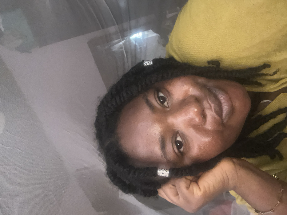The image displays an adult female in a close-up, head-and-shoulders portrait. She has dark skin, dark eyes, and full lips, exhibiting a slight, closed-lip smile. Her dark hair is styled in twists or braids, adorned with several silver-colored hair beads; one prominent bead on the left side of her head features a sun-like or starburst design. Her left hand is partially visible, with fingers curled, appearing to rest against or support her cheek. She wears a mustard yellow or olive-green colored garment with visible texture, and a thin, gold-toned bracelet is on her left wrist. The background is largely obscured by a light-colored, translucent mesh fabric, consistent with a mosquito net, which is draped behind her. A faint, diffuse light source or reflection is visible in the upper right section of the background. The scene is located in the city of Narayi, Nigeria.