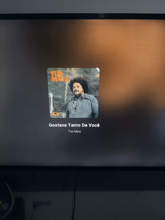 A television screen displays the album art for Tim Maia's "Gostava Tanto De Você