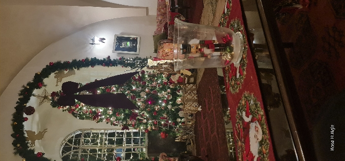 The image depicts a richly decorated indoor space, possibly a living room or lounge, set for Christmas. In the immediate foreground, a dark, reflective rectangular table is partially covered by a red table runner adorned with repeating Santa Claus and wreath patterns. Centered on the runner is a clear glass hurricane vase containing a small red, black, and gold nutcracker figure, accompanied by several small gold and green Christmas ornaments. Behind this, a large, brightly illuminated Christmas tree stands prominently, decorated with numerous white lights, red and white spherical ornaments, and a large dark red bow near its top. A golden star serves as the tree topper. At the base of the tree, several gifts wrapped in patterned gold and white paper are visible, enclosed partially by a small white picket fence. A Santa Claus figurine is situated to the right of the tree's base. To the left of the Christmas tree, a tall arched window with multiple grid panes shows a blurred background of white lights. Above the tree, a festive green garland arch, decorated with gold angels and red ornaments, spans across a light-colored arched wall or ceiling structure. To the right of the tree, in the midground, a seating area with upholstered furniture, possibly a sofa and chair featuring floral patterns, is dimly visible. A wall-mounted light fixture with a single lamp is affixed to the right wall, below which hangs a framed picture or mirror. The floor is covered by a dark red patterned rug. The overall environment suggests a warm, festive atmosphere within a well-appointed interior. No individuals are present.