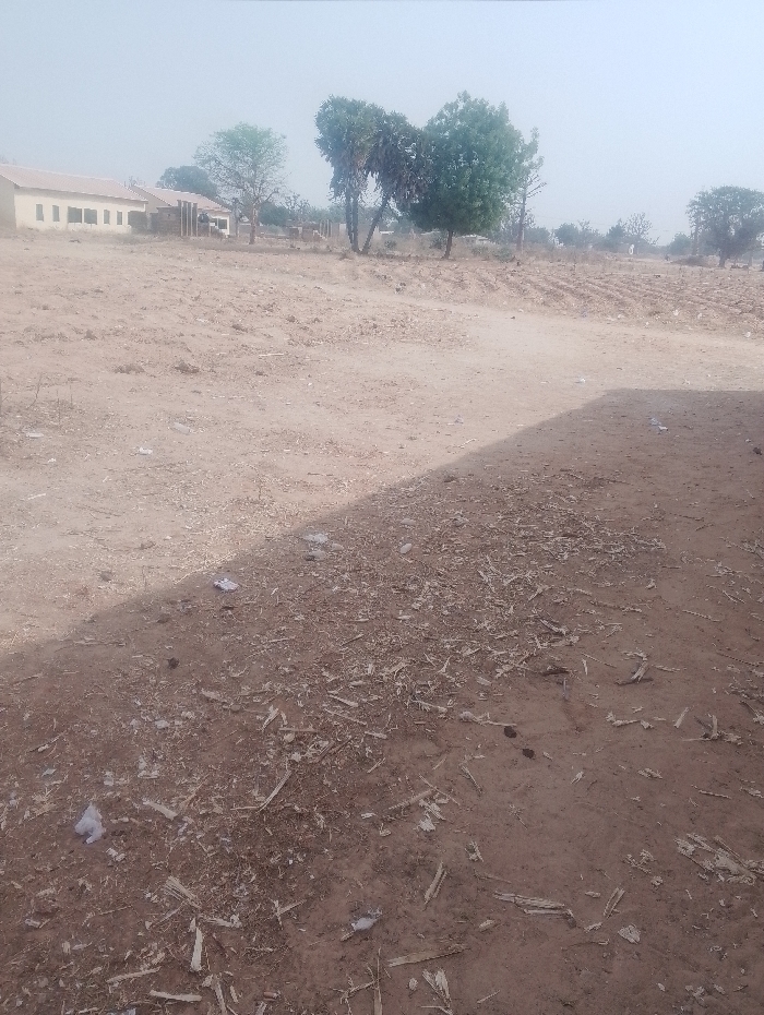 The image displays an outdoor scene in Kanwa, Nigeria, under a hazy, pale-gray sky. The foreground consists of dry, reddish-brown earth, heavily scattered with wood shavings, splinters, and fragments of white plastic debris. A distinct, diagonal shadow line extends from the lower right corner across the ground. The midground features a large expanse of uncultivated, light-brown soil, transitioning on the right side to a field with discernible parallel furrows. In the background, to the left, a single-story building with a light-colored facade and a reddish-brown roof stands, featuring multiple rectangular window openings. A smaller, darker structure is partially visible behind it. Several trees are present in the background: a light-green tree stands near the building, and two tall trees with dense, dark foliage are centrally located. Additional scattered trees and bushes line the horizon. No individuals are clearly visible, and no actions or interactions are discernable.