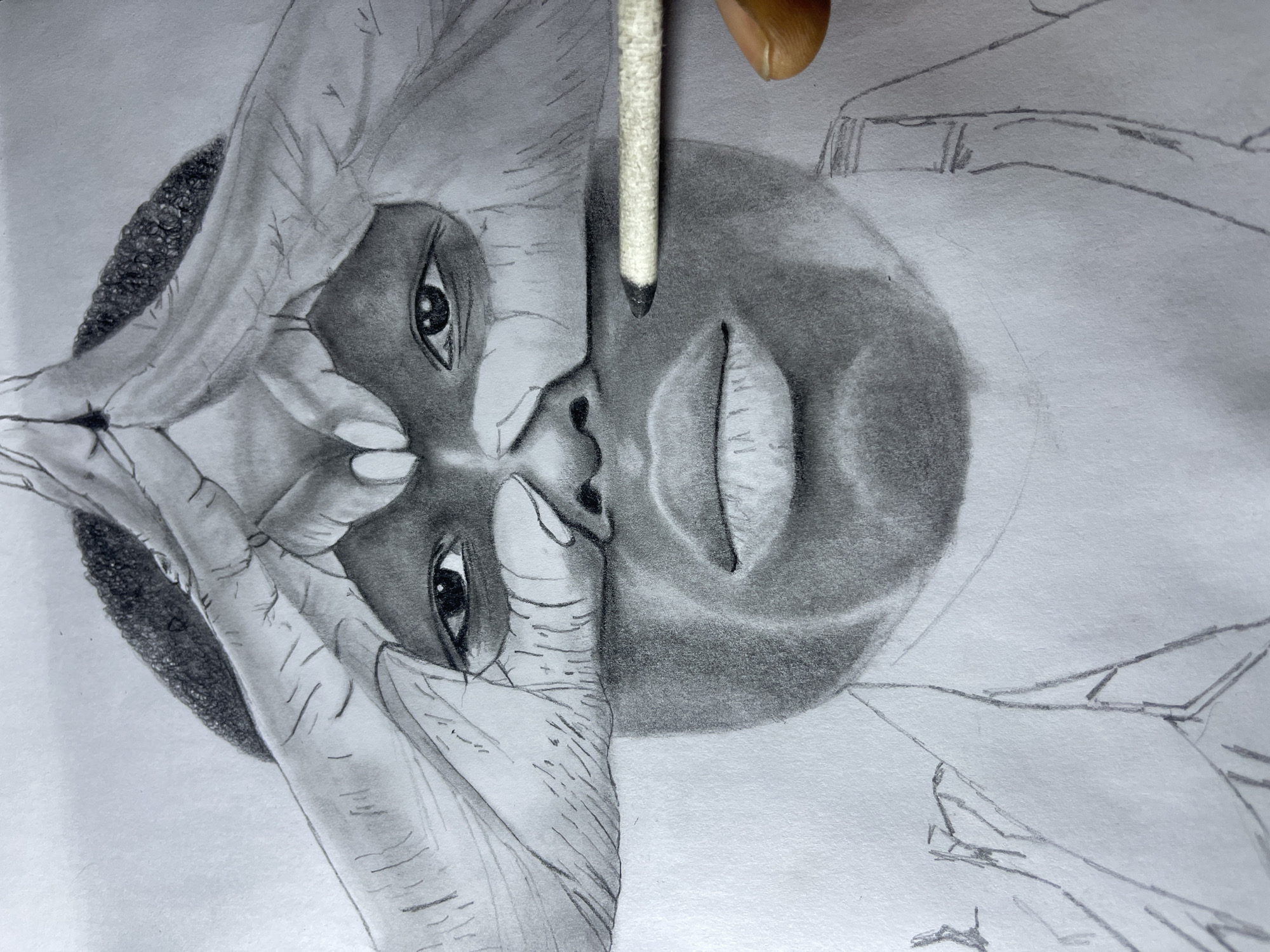 A black and white pencil drawing depicts a person