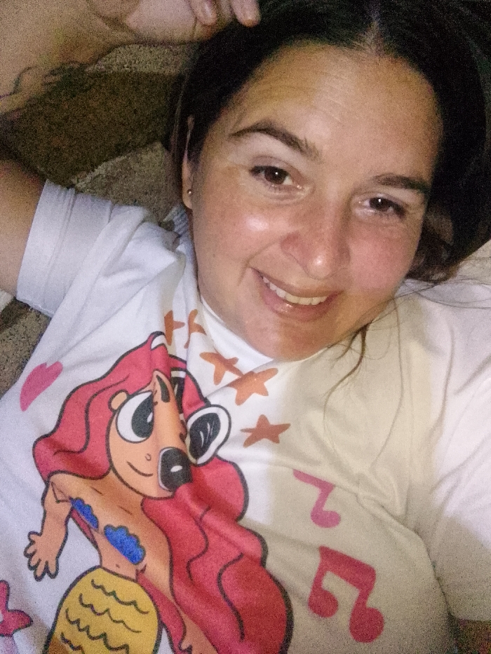 A female subject is depicted in a close-up, upward-angled shot, appearing to be lying down. She has dark hair, brown eyes, and is smiling directly at the camera. Her facial expression is cheerful. She is wearing a white short-sleeved t-shirt featuring a cartoon graphic on the front: a red-haired, mermaid-like character with large eyes, a yellow scale tail, and blue cloud-like patterns on its torso. Surrounding the character are several orange five-pointed stars and pink musical notes. A portion of her right arm is visible near her head. The background is an out-of-focus, textured brownish surface, possibly fabric or a carpet. This scene is located in the city of Altagracia, Venezuela.