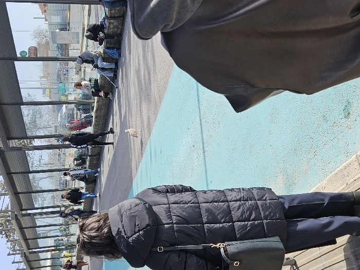 The image displays a daytime scene in a public transportation area within Cascais, Portugal. In the immediate foreground, the back of a person with dark, medium-length hair is visible, wearing a black quilted puffer jacket, dark blue trousers, and dark shoes. A dark handbag with gold-colored hardware hangs from their left shoulder. To the right, the upper back and shoulder of another person wearing a dark hooded garment are partially captured. The midground features a wide, paved pedestrian walkway. A prominent light blue painted strip covers a significant portion of the ground from the lower left to the upper right. On the grey asphalt section, a single, light-colored seagull stands, facing towards the right. Multiple individuals are present on the walkway: three people are walking away from the camera on the left, while a person in a black tracksuit with white stripes walks towards the right. Along a low, light-colored stone barrier on the right side of the walkway, several individuals are seated. These include a woman with curly hair, a man with a grey beard wearing a grey cap and jacket, who holds a metallic walking stick, and other partially obscured figures. Blue bags are resting on the ground near the seated individuals. The background is dominated by a long, modern structure featuring vertical dark-framed glass panels that stretch across the entire frame. Reflections in these panels reveal a clear blue sky, trees, multiple vehicles (including a bus), distant buildings, and what appears to be a street or parking area beyond the structure. A green circular sign with the letter "C" is visible through the glass. The scene is illuminated by bright sunlight.
