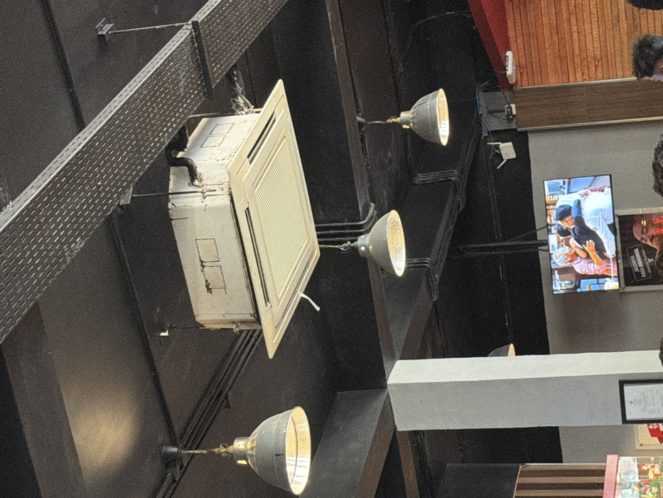 This image depicts an interior view of what appears to be a commercial establishment, likely a restaurant or cafe, located in Lhokseumawe, Indonesia. The ceiling is painted a dark matte color, featuring exposed utilities and an industrial aesthetic. Centrally positioned is a ceiling-mounted cassette air conditioning unit, characterized by a white, square grille with parallel louvers. Above this grille, an older, stained white rectangular metal housing with visible access panels and a dark pipe connection is suspended from the ceiling. To the right, a silver-colored, perforated metal cable tray runs horizontally across the ceiling. Multiple industrial-style pendant lamps with dull grey or silver metal dome shades are suspended at varying heights. One is prominently displayed on the left, illuminated, and two more are visible on the right, also illuminated. Electrical conduits, appearing as dark tubes, are routed along the ceiling. In the lower portion of the image, a light grey or white square column is visible on the left. Further right, a flat-screen television is mounted on a wall constructed of horizontal wooden slats. The television displays a scene featuring three adult males in close interaction, with one appearing to hug another. A "KFC" logo is partially visible in the upper left corner of the television screen. Below the television, a poster or smaller screen displays a person's face and text that includes "JAGONYA RASA ORIGINAL." In the bottom right corner, the tops of the heads of two individuals are partially visible, suggesting the presence of patrons within the establishment.