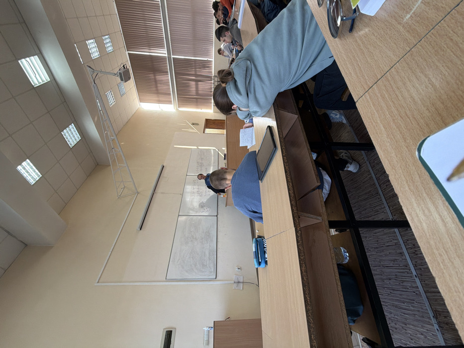 The image depicts an interior view of a university lecture hall or large classroom in Sofia, Bulgaria, observed from the middle of the room looking towards the front