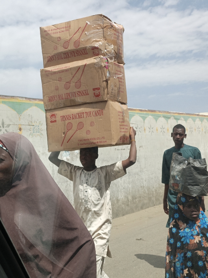The image depicts an outdoor street scene in Fagge C, Nigeria, under bright daylight with a light blue sky and scattered white clouds. In the foreground, to the left, a partial view of an individual, likely female, is visible, wearing a brown head covering. This view is partially obscured by what appears to be a vehicle's window frame. In the midground, centrally positioned, a young male is observed carrying three stacked, brown cardboard boxes on his head. He wears a light-colored, patterned tunic and matching trousers. His arms are raised, with his hands steadying the lowest box. The boxes display red graphics of tennis rackets and balls, along with the text "TENNIS RACKET TOY CANDY," "YIWU HEFIN FOOD CO. LTD.," and an email address. To the right, a young man stands wearing a dark green tunic, looking forward and slightly left. Behind him and to his right, a female child, wearing a dark dress with blue floral patterns, carries a dark, irregularly shaped object on her head, covered by a plastic bag. Her face is visible, directed slightly right. The background consists of a light-colored wall, featuring decorative patterns in green and darker tones, composed of star-like shapes within arched segments. The ground beneath the individuals is a light grey surface. The people appear to be either walking or standing on a paved or unpaved street.