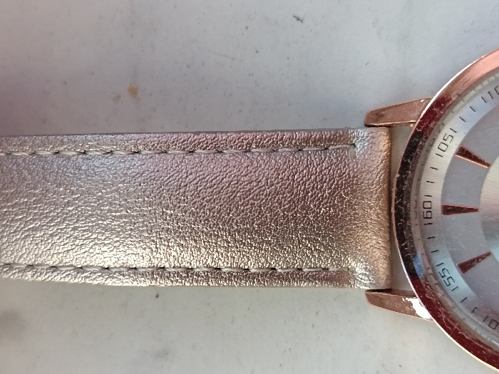 The image displays a close-up, overhead perspective of a wristwatch component. A shimmering light rose-gold or metallic gold-colored strap, exhibiting a fine-grained texture consistent with synthetic leather, dominates the left and central portions of the frame. White stitching runs precisely along both the upper and lower edges of the visible strap segment. To the right, a portion of the watch's circular case and a single rose-gold toned metal lug are partially visible. The metal exhibits minor surface wear or accumulation along its edges. A segment of the watch dial is also apparent, featuring a light background with dark, triangular hour markers and a white minute track displaying small black numerals at 5-minute increments, such as '55', '00', '05', and '10'. The watch rests upon a light, uniformly colored, flat surface, which displays minimal surface imperfections including small dark specks and a faint brown stain in the upper left background area.