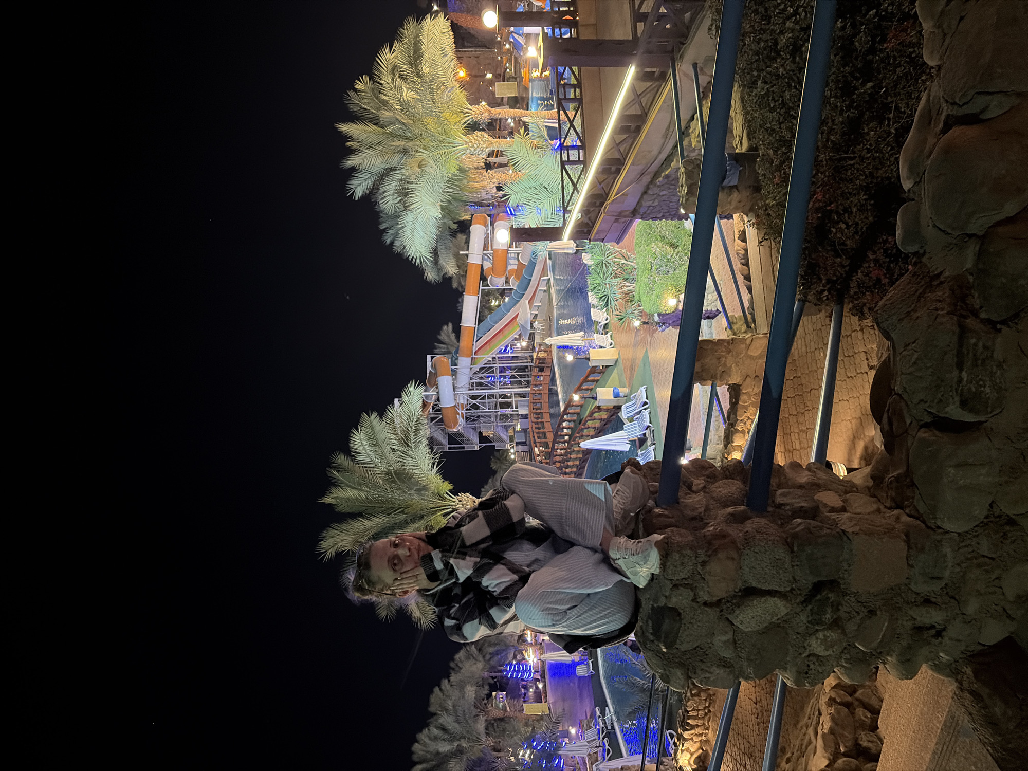The photo shows a woman in a checkered jacket and striped pants sitting on a rock formation at night. Behind her is a water park, lit with blue lights and featuring a slide. Palm trees are visible in the background. The location is Sharm El Sheikh, Egypt.