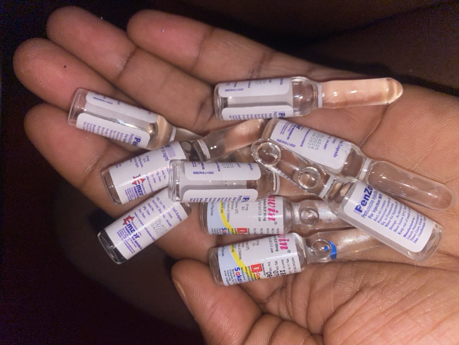 In Tudun Nupawa, Nigeria, a dark-skinned human hand is shown holding approximately twelve small, clear glass ampoules