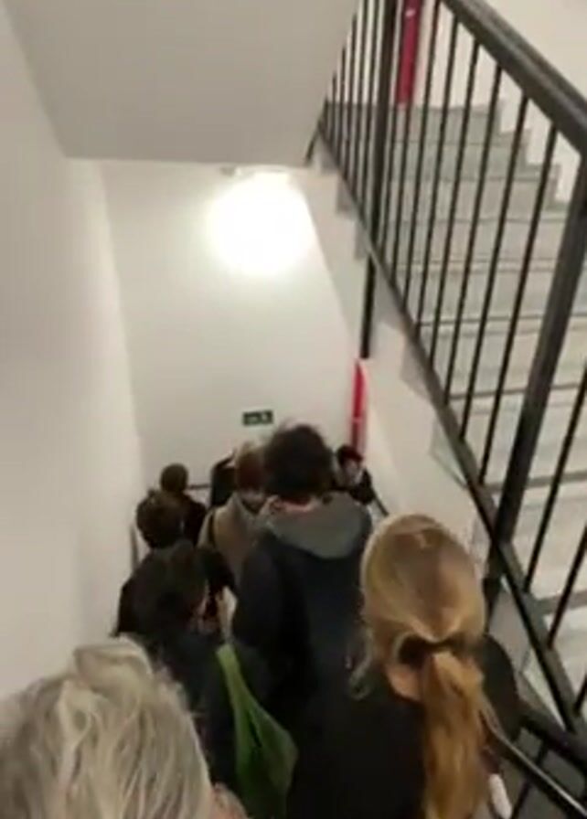 A group of people are walking down a set of indoor stairs. The staircase has white walls and a black metal railing. There is a light fixture at the top of the stairs. The group is diverse in age and dress. The camera follows the group as they descend.