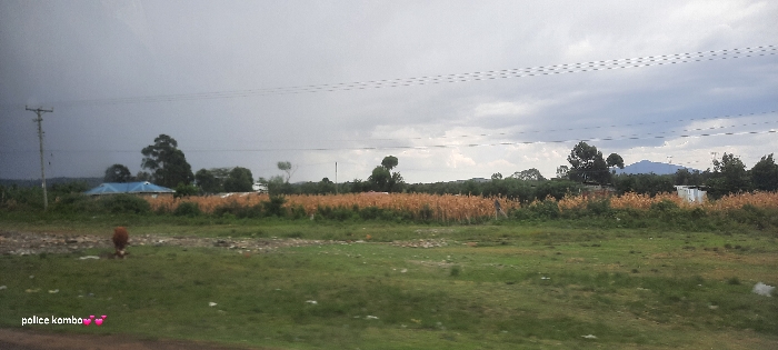 A landscape shows a field of tall, dried corn stalks under a cloudy sky. Green grass covers the foreground. In the distance are houses with blue or silver roofs interspersed with trees. Power lines stretch across the sky. A cow stands in the field near the left side of the image. Mountains are subtly visible in the background. The text "police kombo" with heart emojis is in the bottom left corner.