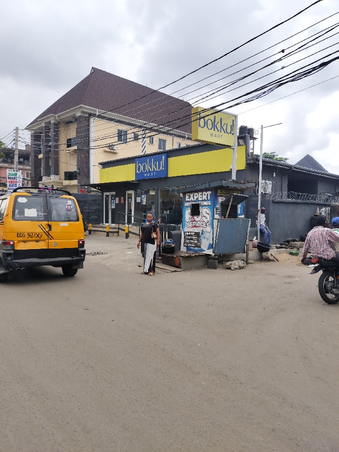 The image displays a street scene in Alaiyabiagba, Nigeria, under an overcast sky. A two-story commercial building, featuring a yellow and black facade with prominent "Bokku! Mart" signage, is centrally located. Behind it, a larger, multi-story structure with a brown hip roof is visible. On the paved road to the left, the rear of a yellow commercial van with the license plate "BDG 921XY" is partially visible. A woman, dressed in a black top and a white maxi-skirt, stands facing forward on the pedestrian area adjacent to the road. To her right, a blue and white street stall, marked "EXPERT INTERNATIONAL POS SERVICES," is situated on an unpaved, elevated section of ground. Further to the right, a male individual in a light-colored shirt is seated on a low wall next to the stall. A person wearing a red and white plaid shirt is mounted on a dark-colored motorcycle, facing away from the camera, on the dirt shoulder of the road. Overhead, numerous black utility lines crisscross the sky. A dark gray wall topped with barbed wire defines the property boundary on the far right. The immediate foreground consists of a grey asphalt road surface.