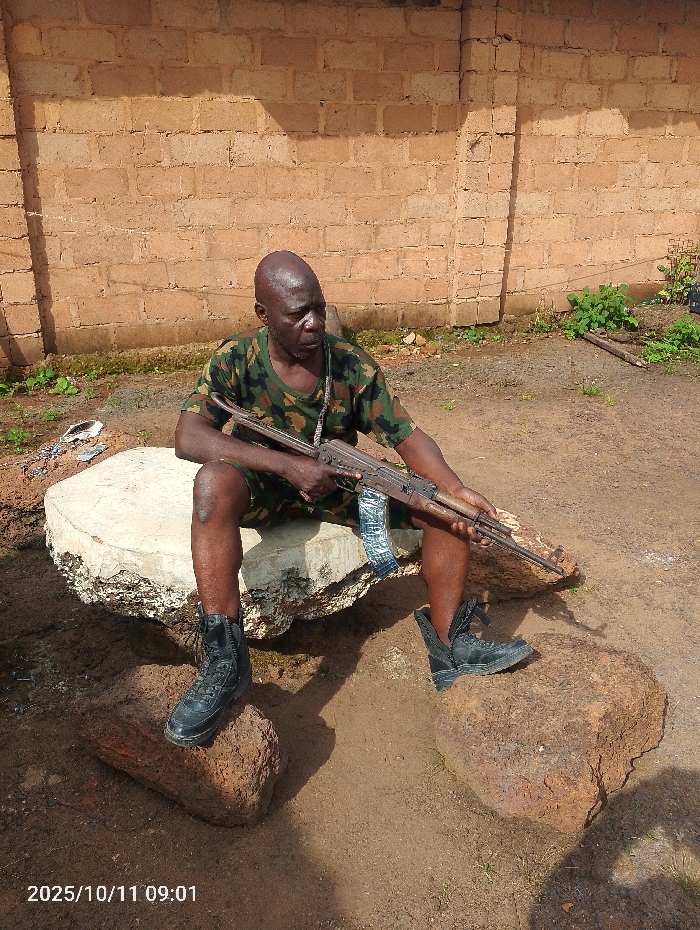 An adult male with dark skin and a bald head is seated outdoors, facing slightly left of the viewer, holding a rifle