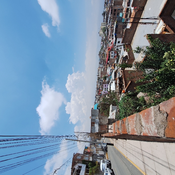A street scene shows a row of parked cars lining the right side of a road. A sidewalk bordered by a brick wall runs alongside, with lush greenery spilling over. Beyond, a densely packed urban landscape of buildings rises toward a bright sky filled with fluffy clouds. Power lines crisscross the bottom left of the frame, adding to the urban feel.