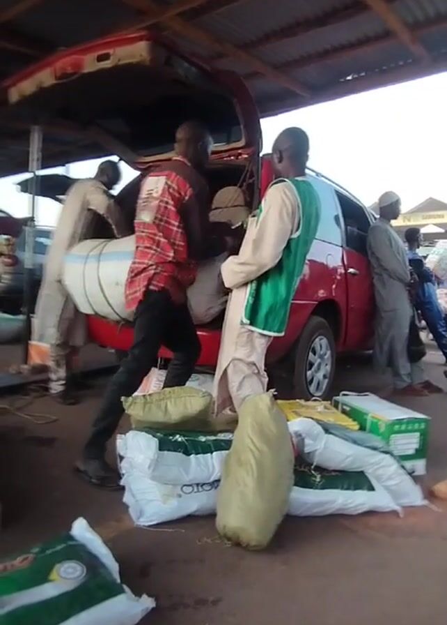 several men loading large sacks of goods into the back of a red minivan. The van's trunk is open, and several bags, boxes and a large white barrel are already inside. Other bags are on the ground near the vehicle. The men are working together to lift and fit the sacks into the vehicle. The scene appears to be taking place at a market or trading area, possibly outdoors, under a metal roof. Other people are visible in the background.