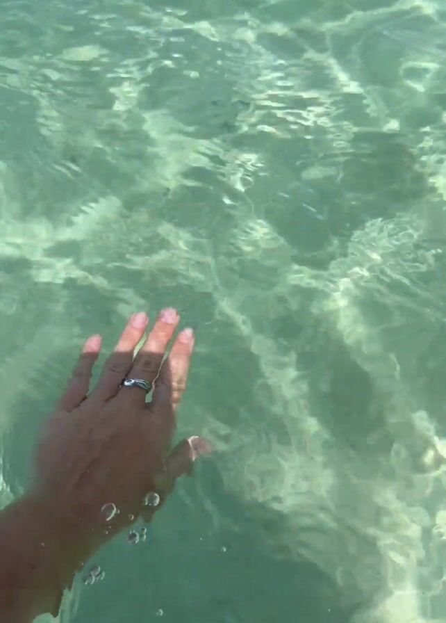 A hand is immersed in shallow, clear, light green water. The water has a rippling surface reflecting sunlight, and the sand below is visible. A ring is visible on one of the fingers. The hand is moved around in the water.