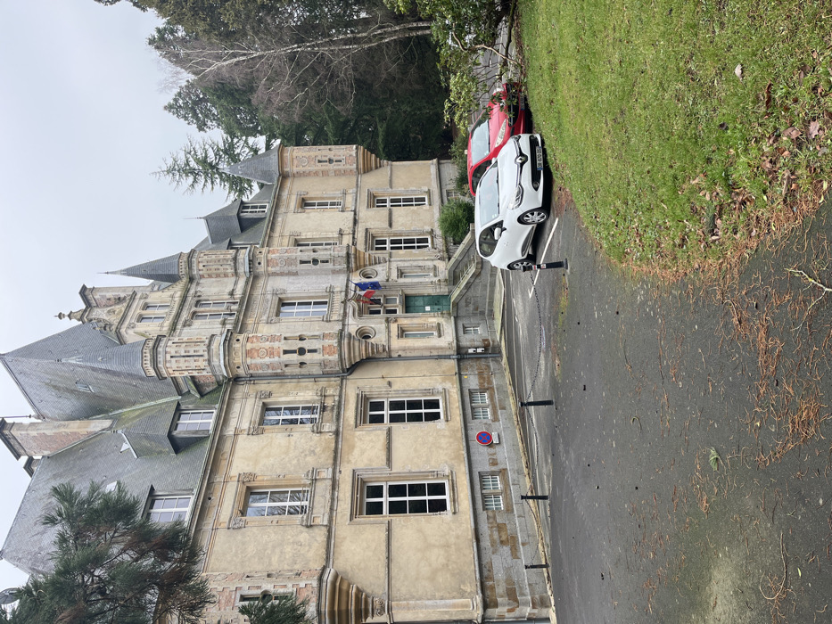 The image presents an exterior view of a multi-story, ornate stone building located in Bagnoles de l'Orne Normandie, France, under an overcast sky. The building, constructed with a light beige facade and reddish-brown architectural detailing, features multiple turrets with pointed dark grey slate roofs, numerous white-framed windows, and several chimneys. A central entrance, accessible via a stone staircase with railings, has green double doors. Above this entrance, three flags are displayed: the French national flag, a red flag with a yellow cross, and the European Union flag. The building's lower section includes a visible stone plinth with smaller rectangular windows. In the foreground, an asphalt driveway or parking area is present, strewn with fallen pine needles and small debris. A series of black bollards connected by chains demarcates a section of this area. A circular red no-parking sign is affixed to the building's facade near the ground level. Two vehicles are parked on the right side of the driveway: a white five-door Renault Clio hatchback, with a partially visible French license plate (DR-479-DD), is in the immediate foreground, followed by a red five-door hatchback parked behind it and partially obscured by green shrubbery. The right side and background of the scene are densely populated with evergreen coniferous trees and some bare deciduous trees. A strip of green grass separates the driveway from the wooded area on the right. No individuals, actions, or interactions are visible in the scene.