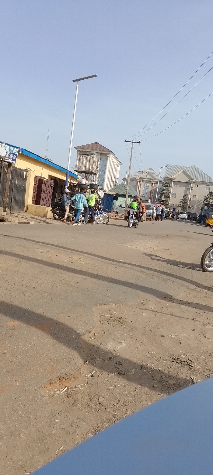 The location is a street in the city of Sardauna, Nigeria. The environment is an outdoor urban setting under clear daylight, with a light blue sky. A blurred blue surface occupies the bottom foreground of the frame. The road surface consists of degraded asphalt interspersed with sections of exposed earth, significant dust, potholes, and loose debris. Shadows extend across the road surface from left to right. On the left side of the street, approximately five individuals are congregated near a single-story yellow building with a blue corrugated metal roof and brown metal security doors/shutters. Within this group, two motorcycles are present, appearing stationary. One person, wearing a light blue shirt and jeans, stands adjacent to a dark motorcycle. Another individual, dressed in a bright green shirt, stands near a second, lighter-colored motorcycle, balancing a dark, round basin on their head. A third person, wearing a blue cap, is partially visible near the first motorcycle. Behind this yellow building, a multi-story, light-colored structure with a distinctive brown, multi-faceted roof is visible. A tall, white streetlight pole with a horizontal rectangular fixture stands prominently in the mid-left area. Further down the road, another individual rides a motorcycle towards the camera, wearing a green vest over dark clothing. Utility poles with multiple overhead wires line the right side of the street. In the background on the right, a large, multi-story, light-colored building with a peaked roof and numerous windows is visible. Several other vehicles, including cars and a yellow motorized tricycle, along with additional pedestrians, are present in the distance, indicating ongoing street activity and traffic.