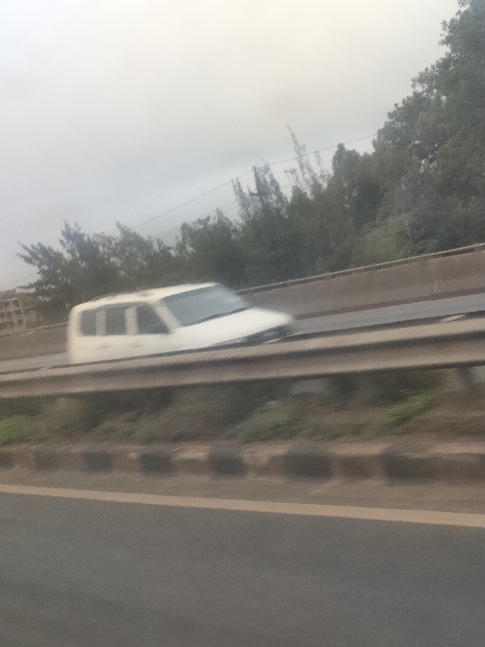 A forensic examination of the image reveals an outdoor scene depicting a multi-lane road environment under an overcast sky, consistent with the Kahawa Sukari ward, Kenya. The perspective indicates the photograph was captured from within a moving vehicle, looking across to a parallel road. In the immediate foreground, a dark gray asphalt road surface is visible, separated by a light-colored line from a concrete curb containing dark rectangular blocks. Beyond this curb, a two-bar metal guardrail runs horizontally across the mid-section of the image. Directly behind the guardrail, a light-colored multi-purpose vehicle (MPV) or sport utility vehicle (SUV) is in motion from left to right. The vehicle, primarily white or light gray, is heavily motion-blurred, suggesting a significant speed relative to the camera. A roof rack is discernible on the vehicle's roof. Behind the vehicle and its lane, a dense line of dark green trees and shrubs forms a visual barrier against the horizon. Some taller, thinner tree silhouettes are visible further back. Faint, thin lines, consistent with utility wires, traverse the upper background horizontally above the treeline. The sky is uniformly light gray, indicating heavy cloud cover. No individuals are visible in the frame. The overall impression is a highway or major road on a potentially hazy or overcast day.
