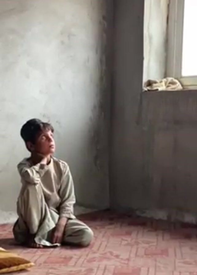 A young boy with dark hair is sitting cross-legged on a patterned red and pink floor in a sparsely furnished room. He is wearing a light brown, loose-fitting outfit. The walls of the room are unfinished concrete. A window is visible in the upper right corner of the frame. The boy is looking upwards, possibly at the window. A pillow is on the floor to the left of the boy. The lighting in the room is dim.