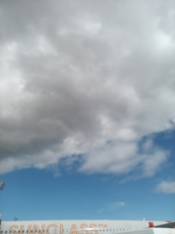The image displays an outdoor scene in Ojos de Garza, Spain, centered on the upper portion of a white passenger aircraft under a mixed cloudy and blue sky. The aircraft's fuselage, visible in the lower frame, features orange lettering that partially spells "SUNGLASS" and an orange stripe near its rear. Above the aircraft, the sky transitions from a predominantly grey, overcast cloud layer in the upper half to a clear blue sky with some scattered white clouds in the lower middle and right. No persons or explicit actions are discernible. The image is generally blurry.