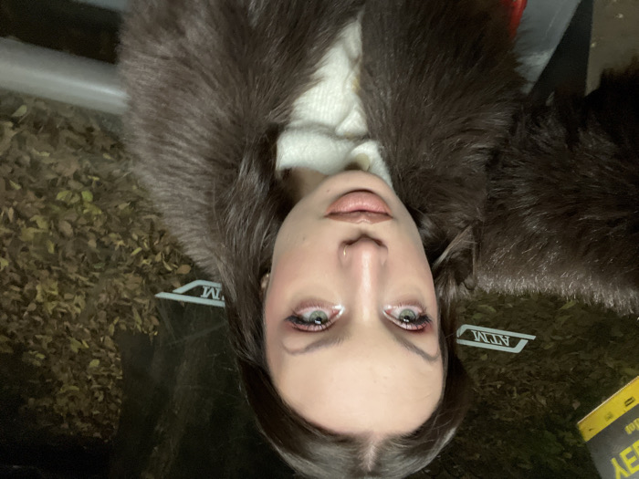 An upside-down portrait of a woman with fair skin, green eyes, and glossy lips. She wears a brown fur collar over a cream-colored top. The background includes a dark, shiny surface, possibly a car hood, scattered with leaves and the corner of a yellow object with black text. A white sticker with "ATM" is visible on the surface.