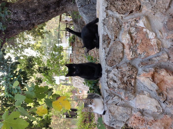 The scene depicts three domestic cats positioned on a stone wall in an outdoor setting within the Mate Asher Regional Council, Israel