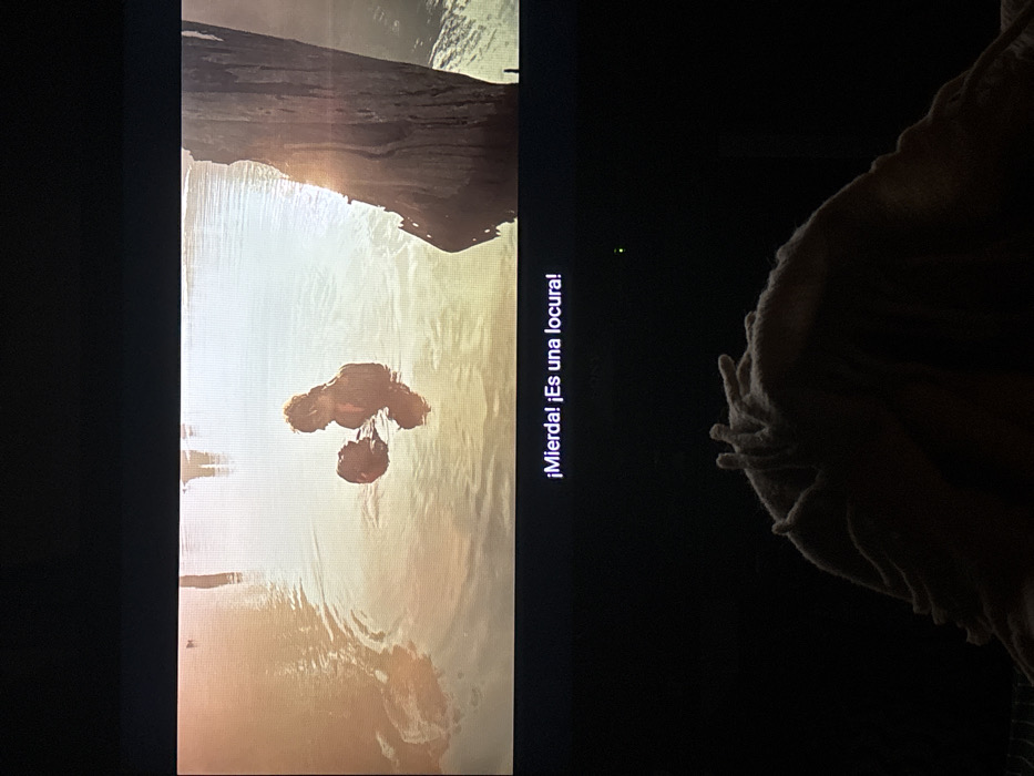 The image displays a television screen showing a cinematic scene, with Spanish subtitles, observed from a dark indoor environment