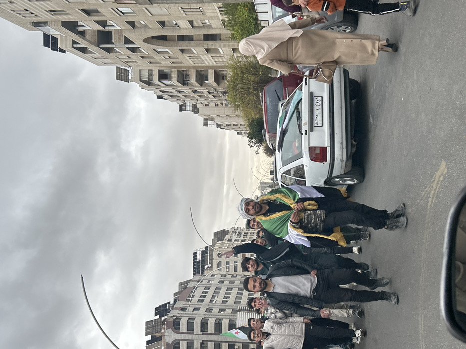 The image depicts a daytime scene on a city street in Al-Mazza Municipality, Syria, under an overcast sky