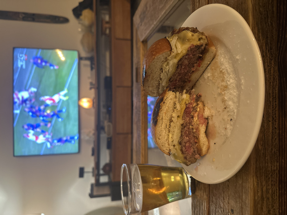 A partially eaten burger cut in half sits on a white plate with crumbs. To the left, a glass of beer is visible. In the background, a TV screen displays a football game with players in blue and red uniforms on a green field. Shelves and other furniture are blurred behind the TV. The setting appears to be a casual dining environment, likely a home or restaurant. The overall image suggests a relaxing meal and entertainment.