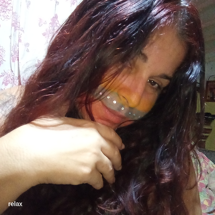 A woman with long, wavy, dark red hair gazes at the camera. Her face is painted with an ombre of orange and yellow, adorned with a decorative gray band dotted with sparkling gems across her nose and mouth. Her left hand is raised near her cheek. A floral-patterned curtain is visible in the background. "Relax" is written in the lower left corner.
