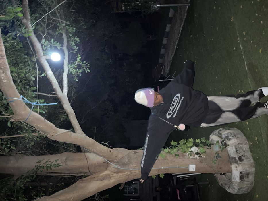 The image depicts an outdoor nighttime scene on a grassy lawn in Adankolo, Nigeria. In the center-left, a person stands with arms outstretched, facing slightly right with their head tilted downwards. This individual wears a white and purple knit beanie, a black oversized hoodie with white text reading "ADB" and "GURITTCANDORMS" (reversed on the hoodie), grey and black patterned pants, and white sneakers with black stripes. A small pink fuzzy spherical bag hangs from their left shoulder. To the left, a large tree with light-colored bark anchors the scene. Its base is surrounded by a low stone planter, and green leafy vines are wrapped around the lower trunk. A white electrical outlet is affixed to the tree trunk. A bare, bright white light bulb hangs by a wire from one of the tree's branches, illuminating the immediate area. Blue plastic strips are tied to higher branches. In the far left background, a second individual is partially visible, seated at a dark table. The ground is covered by neatly trimmed green grass. In the background to the right, a low border or curb with alternating black and white stripes runs horizontally. The distant background is dark, showing outlines of dark foliage and unidentifiable structures, consistent with a nighttime setting.