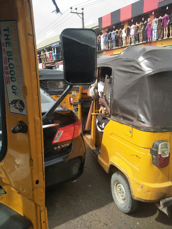 This image depicts a congested urban street in Ajah, Nigeria