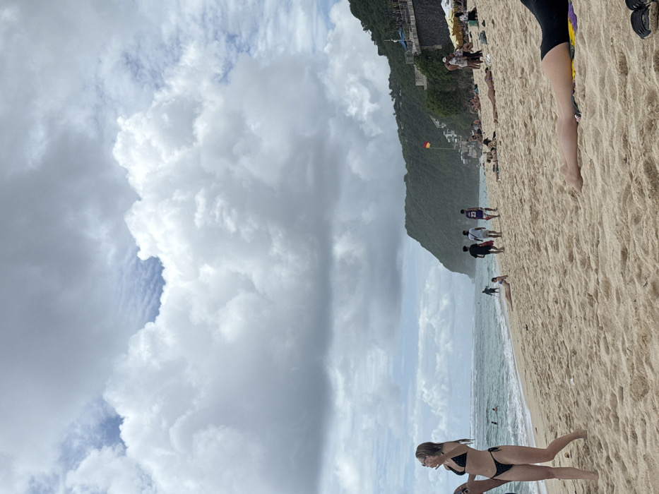 A beach scene with an overcast sky and calm, light blue water. A sandy beach is populated with people, some in swimsuits and others in athletic wear. A lush green mountain rises in the background. The beachgoers engage in various activities, including sunbathing, walking, and standing near the shoreline. The clouds dominate the upper half of the image, creating a diffused light over the scene.