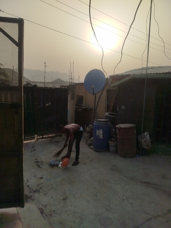 A person sweeps debris with a broom in an outdoor area. The space is cluttered with barrels, buckets, and other items. A satellite dish is mounted on a nearby structure. Overhead, power lines stretch across the sky where the sun is shining brightly. A partial gate is visible on the left side. The scene appears to be a residential or industrial area with a combination of structures and open space.