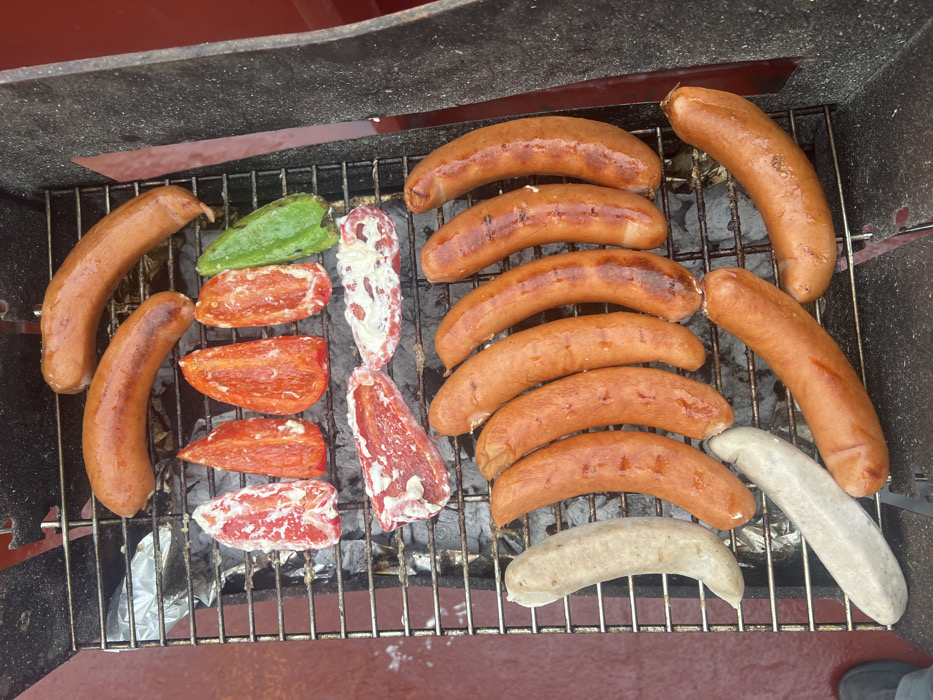 The image displays an overhead view of a charcoal grill in the city of Bangor, United Kingdom, actively cooking various food items. The grill grate supports multiple subjects. In the top section, three brown, cooked sausages are visible. Below these, five halved bell peppers are arranged: four red peppers and one green pepper, each filled with a white creamy substance, consistent with cheese or a similar dairy product. Further down, two irregular pieces of red meat, one topped with a white creamy substance, are situated next to two additional red bell pepper halves, also filled with the white substance. The lower portion of the grill grate holds ten sausages; two are lighter in color, appearing less cooked or a different variety, while the remaining eight are brown and cooked, displaying varying degrees of charring. Charcoal embers are visible beneath the grate, with aluminum foil present in some areas. The grill's exterior appears dark, with some red elements. To the left and bottom-left of the grill, a reddish-brown textured surface is visible, alongside a partial view of a dark shoe or boot in the extreme bottom-left corner. A dark gray vertical surface frames the right side of the image. No individuals are fully visible.