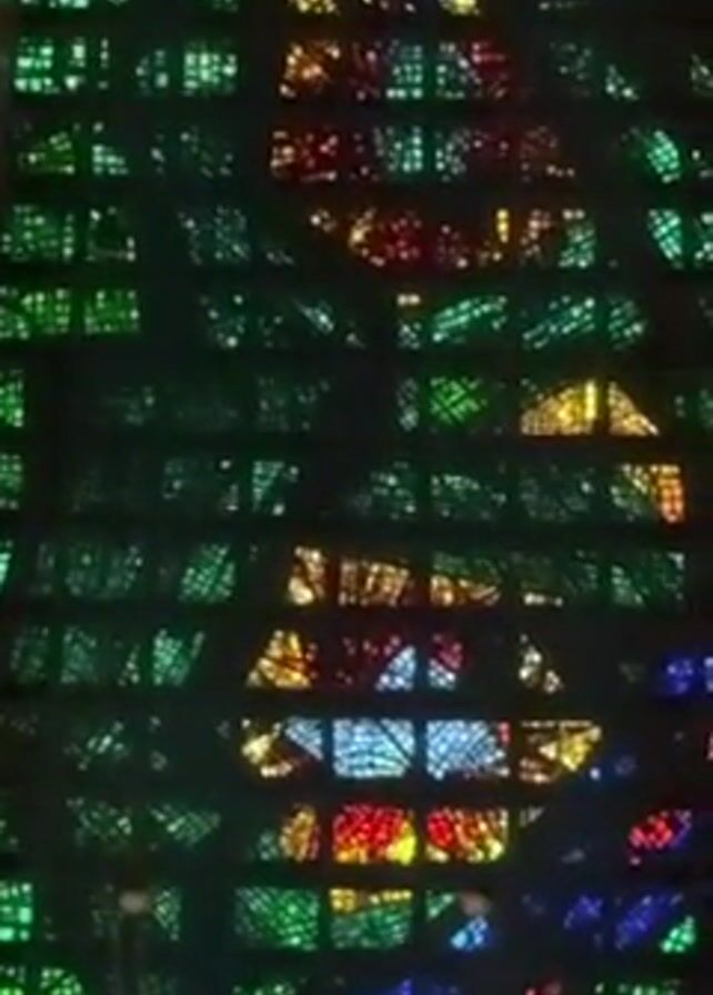 interior of a large, dark church. A tall, central stained-glass window is visible, stretching from the floor to a cross-shaped opening in the ceiling. The window features many small panes of colorful glass, primarily green, red, blue, and yellow. Rows of empty chairs fill the floor area of the church. The camera zooms out from a close-up of the stained glass to show the entire interior of the church.