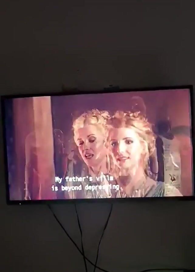 The video depicts a television screen displaying a scene from a film or television show. The scene features several women, likely in ancient Roman or Greek attire, standing in an indoor setting. One woman is wearing a red gown, while another is in a green dress. Two statues of Roman or Greek warriors flank the women. Subtitles at the bottom of the screen display dialogue from the scene. The subtitles read, "My father's villa is beyond depressing," followed by "It's unfortunate your husband couldn't join you. How fares the Legatus?" The camera angle is slightly low, looking up at the television. The room is dimly lit, with only the light from the screen illuminating the surroundings. There are some cables visible beneath the TV screen.