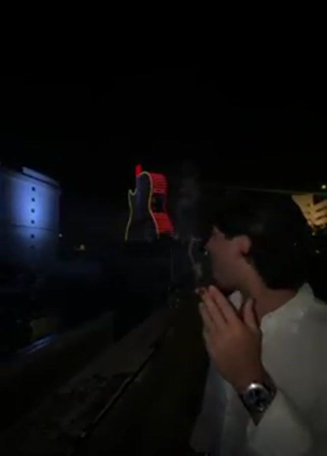 A young man stands on a ledge at night, smoking. He is wearing a white shirt and a dark baseball cap. Behind him, an illuminated, outlined guitar shape stands out against the dark sky. To his left, a light shines on a structure with windows. Smoke from his cigarette is visible in the dark. He looks at the camera.