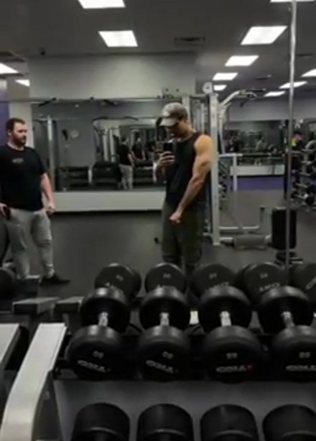 man in a gym taking a selfie in the mirror, flexing his right bicep