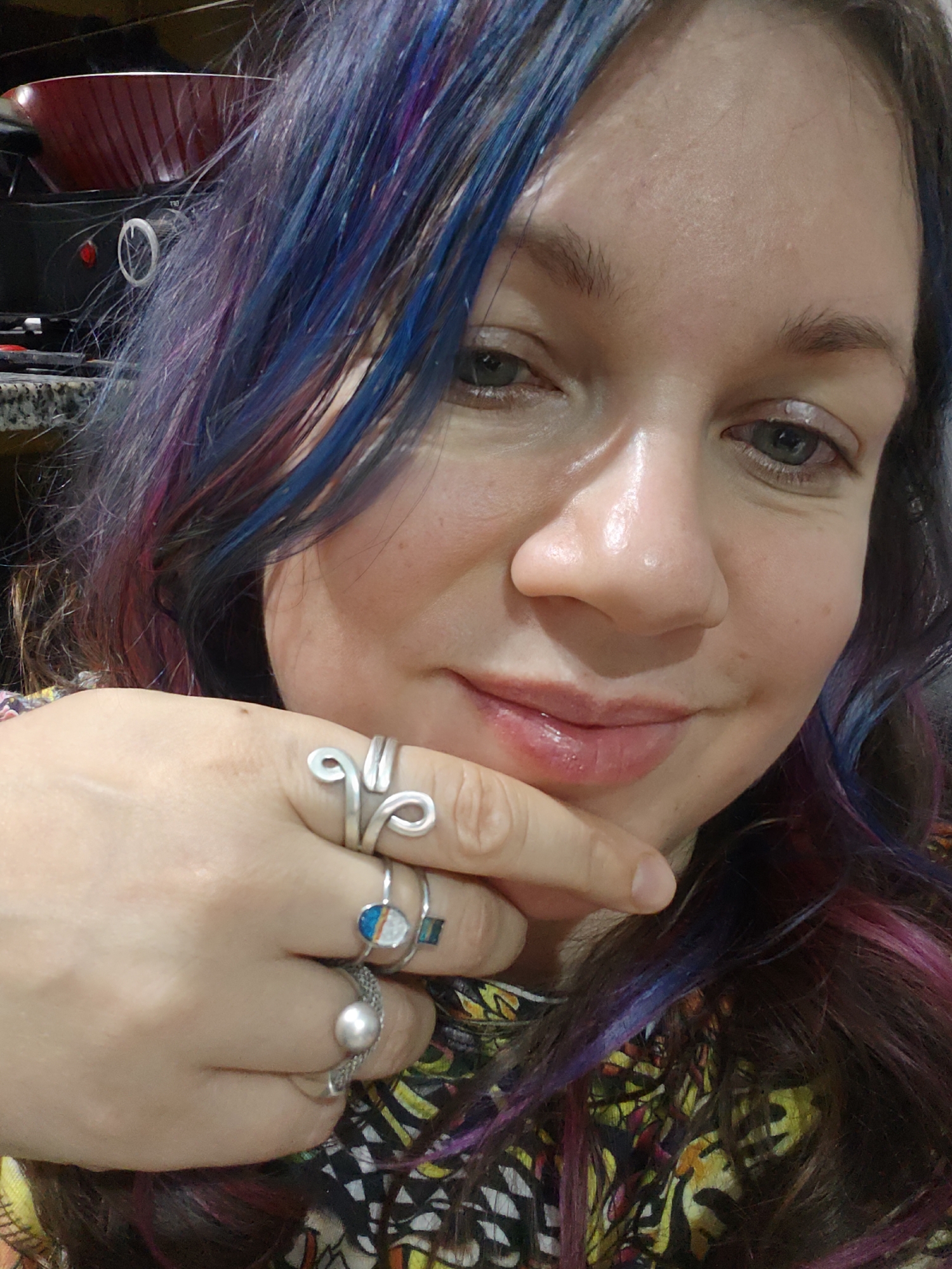 An image depicts an individual, likely female, captured in a close-up, chest-up orientation within what appears to be a kitchen setting in the city of Al Hadaba, Egypt. The subject possesses a fair complexion, with a visible sheen on the forehead and nose. Her hair is long, dark brown, and features prominent streaks of blue, purple, and pink dye. She has greenish-grey eyes and her lips are glossy and pink. Her left hand is raised, with the index finger lightly touching her chin or lower jawline. The hand is adorned with multiple silver rings: one on the index finger featuring a large, twisted wire design; two on the middle finger, one with an oval-shaped multi-colored inlay (blue, orange, white) and another thin band; and one on the ring finger with a single, spherical pearl. A patterned garment, featuring abstract shapes in yellow, black, white, and red, is visible on her shoulder. The background is blurred but shows a dark-colored stovetop with at least one white control knob and a red-orange cooking pan or bowl resting on it, alongside a speckled countertop.