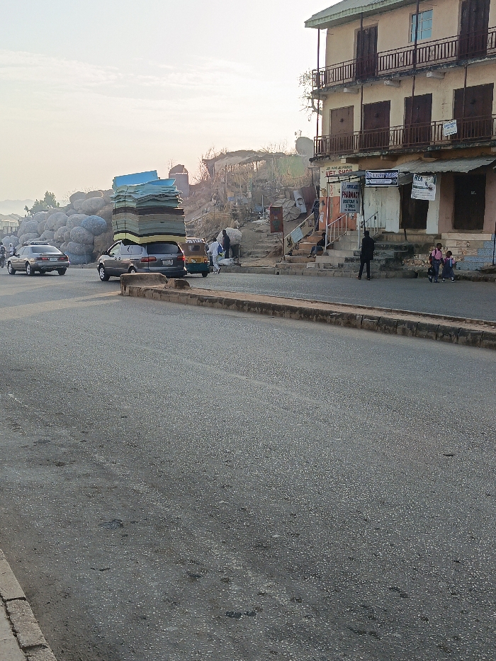 An image showing a car loaded with stacked mattresses drives on a city road. A silver car is in front, and a tricycle is behind the loaded car. On the right side of the street, there is a three-story building with shops and people outside. Some children are in the front of the building, and a man is standing near them. The road occupies a large portion of the view, and there are small rounded stones in the background.