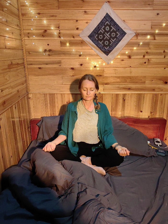 The scene is set indoors within a room in Tả Van, Vietnam. A single adult female with fair skin and light brown hair, styled in a braid over her left shoulder, is positioned centrally, seated cross-legged on a bed. Her eyes are closed, and her facial expression is tranquil, indicating meditation or deep contemplation. She wears a light grey t-shirt, an unbuttoned teal long-sleeved shirt, dark pants, and light pink socks, with her hands resting palms down on her knees. The bed features a dark reddish-brown wooden headboard and is covered with dark grey bedding, including a duvet and a pillow supporting her back. The walls behind her and to her left are paneled with light-toned horizontal wooden planks. A string of warm-toned fairy lights is draped horizontally across the wooden wall. Centered on the wall above her head is a diamond-oriented fabric artwork with a light background and a dark blue and green geometric pattern. To her right, on the bed, are a white smartphone, a black portable JBL speaker, and a dark-covered book. The overall environment suggests a private, illuminated space designed for relaxation or meditation.