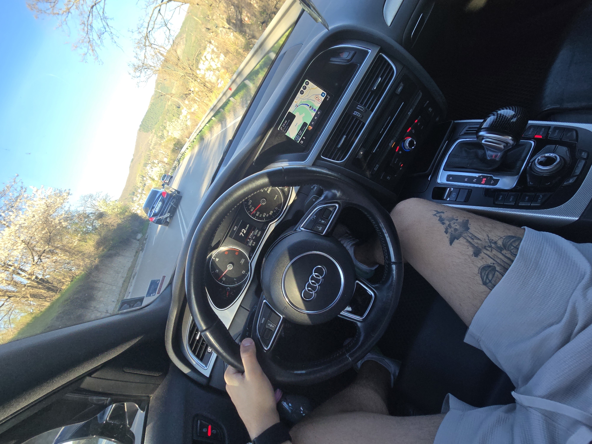 interior of an Audi car while in motion on a road with a landscape visible through the windshield. The driver's perspective is evident, with a hand on the steering wheel. The car's dashboard displays navigation and speed information (72 km/h). The car's gear shift is visible. A person is wearing shorts, revealing a tattoo on their thigh. The location is identified in Vladaya, Bulgaria, based on the map displayed on the dashboard. Another car is visible in front. Cherry blossoms are visible alongside the road.